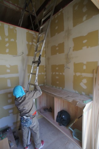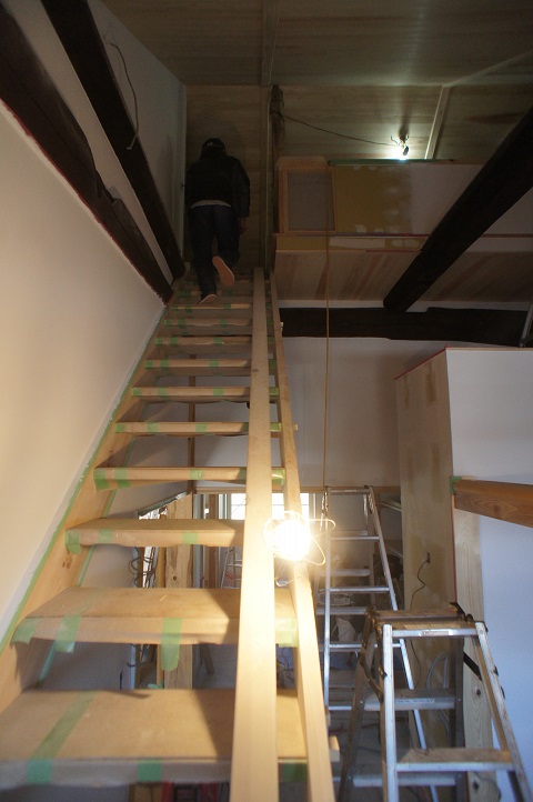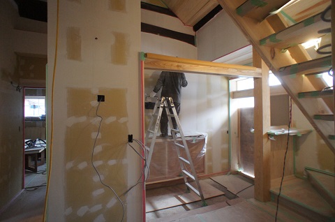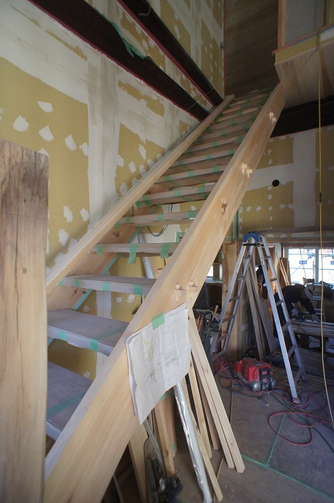 大工事も今日で完了予定で、長い間泊まり込んで頑張ってくれた大工の面々に感謝です。しかし、工事着手前の風景と本当に様変わりましたね・・・古材も見事ですが、新しい木目の美しさも良いですねー、内装の仕上がりがとても楽しみです。