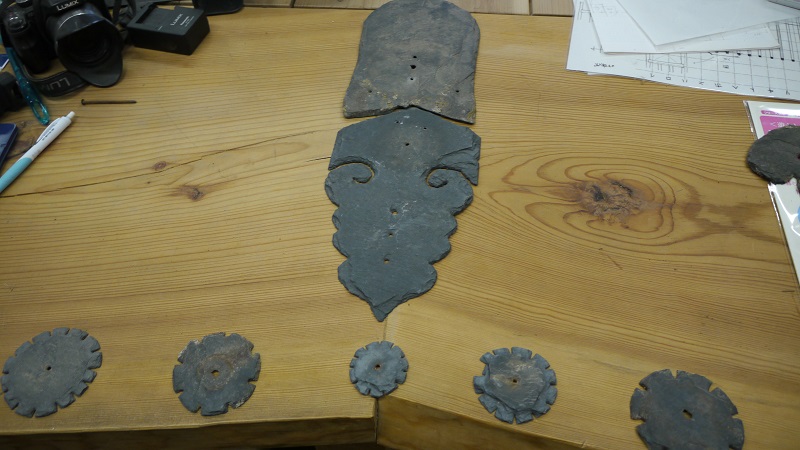 移築の為の解体時に妻面の矢切から外したスレートのデザインが素敵なので玄関ドアのどこかにに使えればと私は思い提案しておりますが・・・。