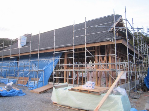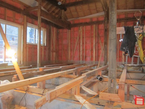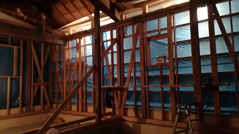 外部軒天井工事が完了して、内部の床下地が進んだ移築大改修現場です。