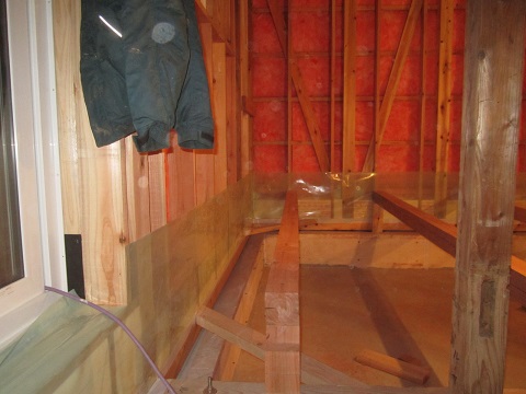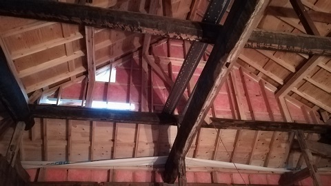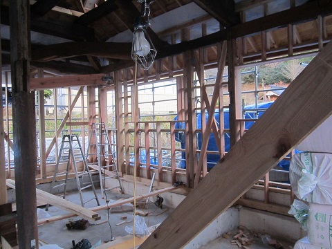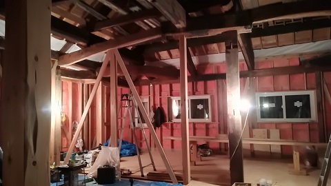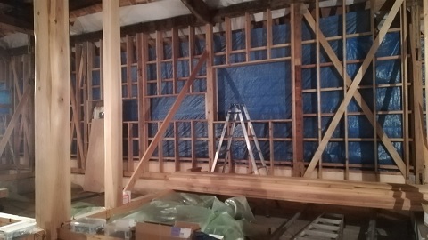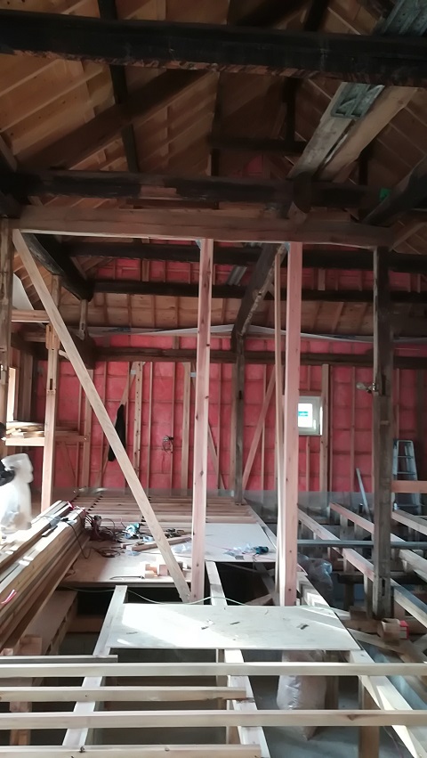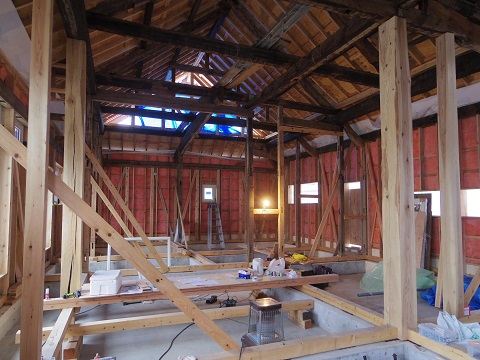 内部から見ると、外断熱が綺麗に充填されています。古材の雰囲気が良くて、完成が楽しみです。