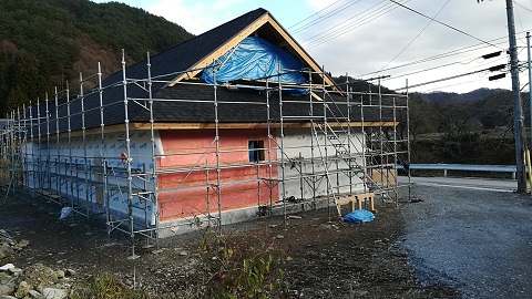屋根工事が完了して、構造補強と外部断熱受け下地の取り付けが進みました。
