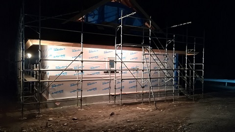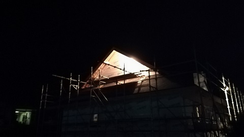 外断熱が進んで外部の囲い込み完了で一安心です。ライトアップの姿もいい感じです。