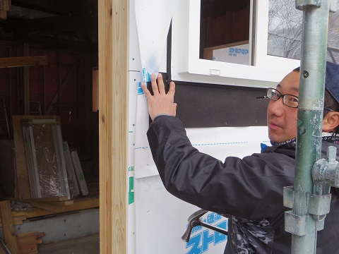 開口部の防水処理を行う佐々木大工です。