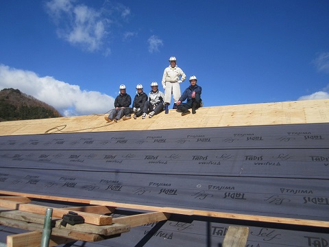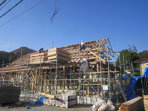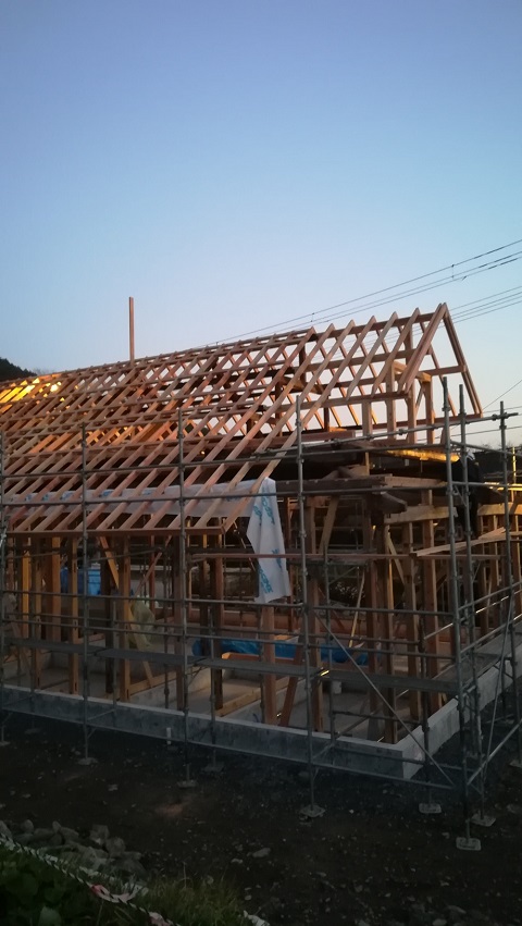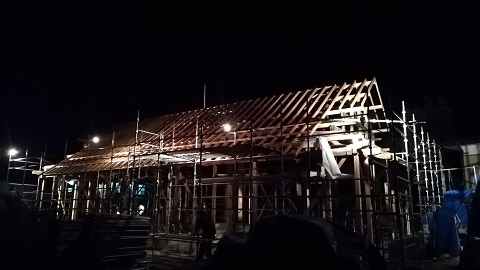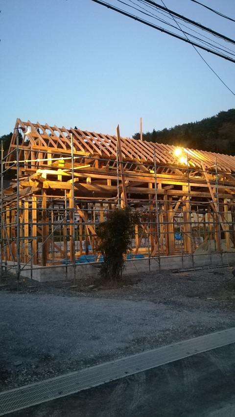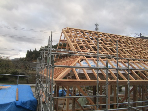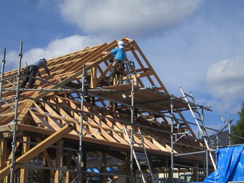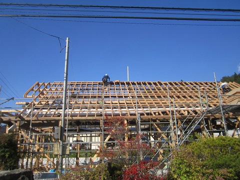 大工屋根部の工事が勢いよく進んで、姿ができてまいりました。高い所にいる大工のかっこよさです。