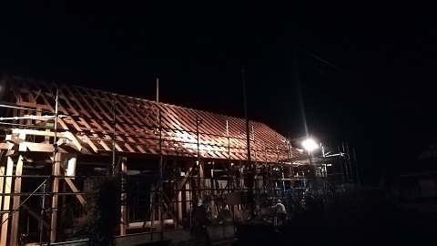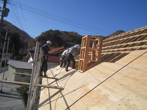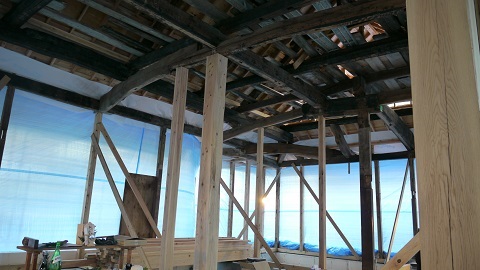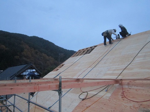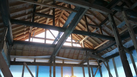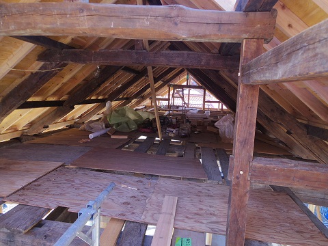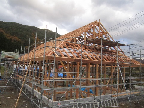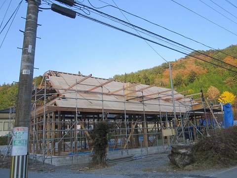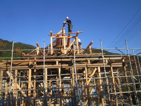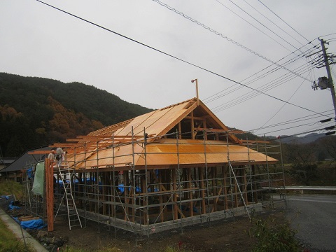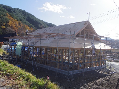 またまた、矢作の移築大改修現場ですが、野地板張りが進み、屋根形状が出来てきました。個人的にこの構造形状が好きなのと、同業者の方々にも興味を持っていただけるのではないかと思うのですが、如何でしょうか?