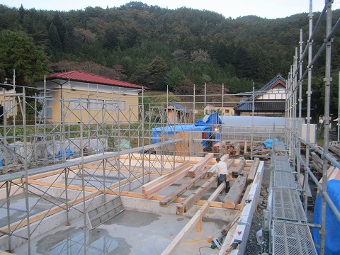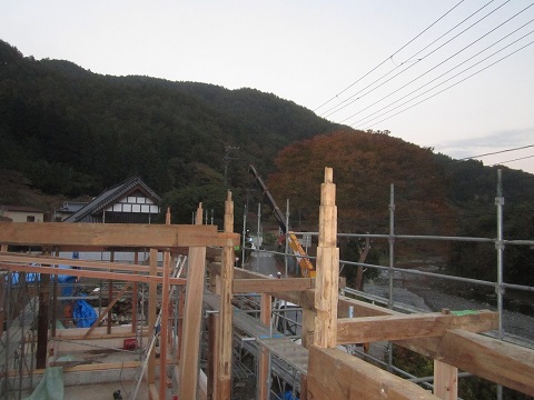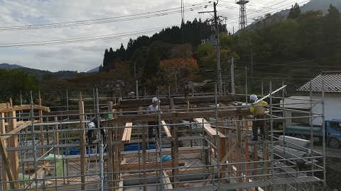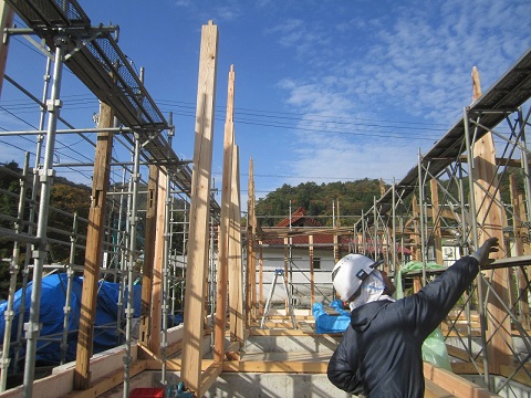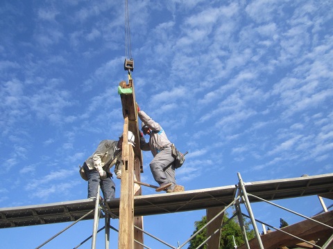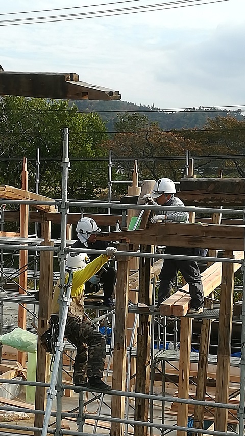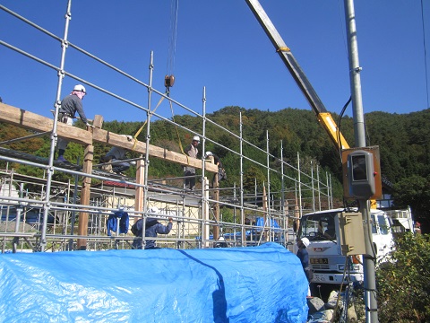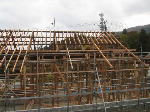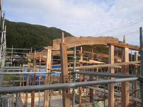 建て方風景の大一番処です。月が丘の新築工事の建て方がはじまれば、この木組みとそん色ない雰囲気になる筈です。