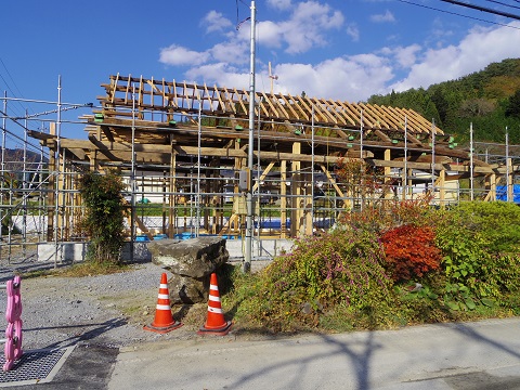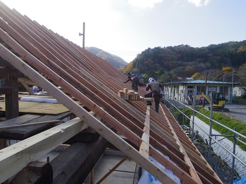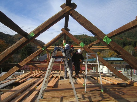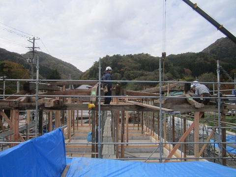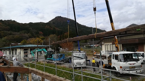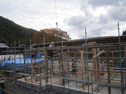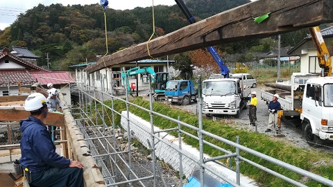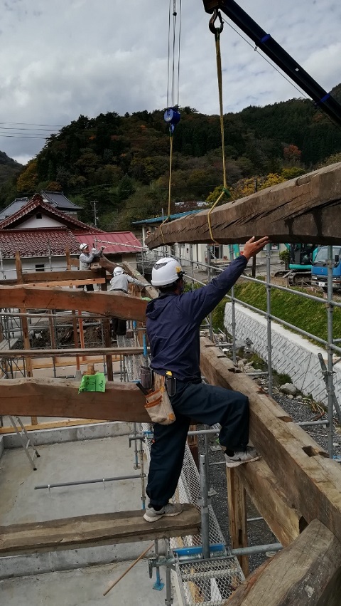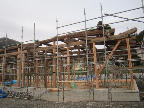小屋組みが始まりました。完全移築の復旧工事的になりました。