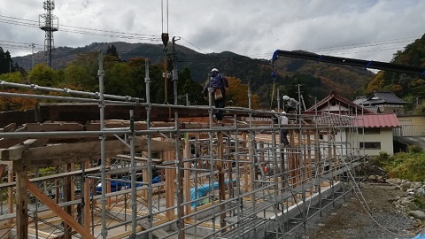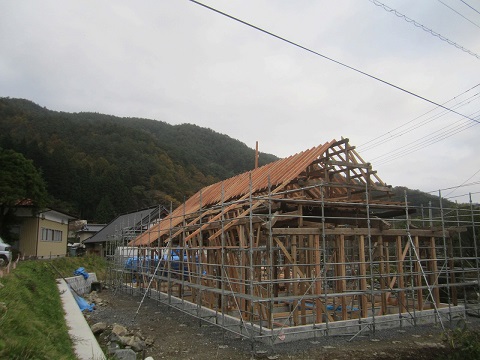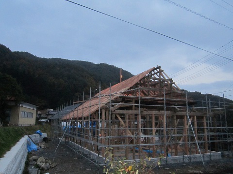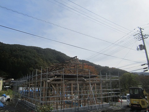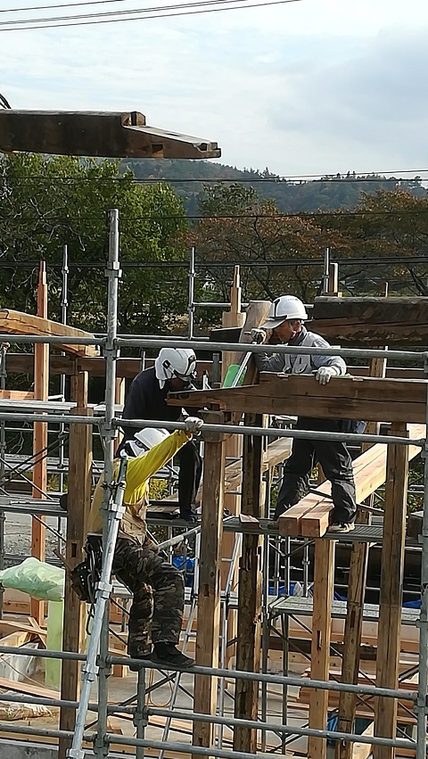 建て方がどんどん進んでいます。重ホゾ組の木組みはかなり頑丈です。昔の人の凄みがとても良くわかります。金物屋や構造面材に頼る現代の建物など足元にも及ばない自然の木を熟知した素晴らしさなのだと思います。