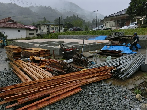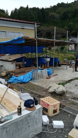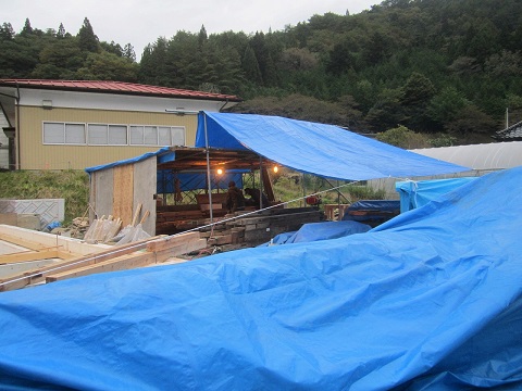 現場横には現場加工用の仮作業場も作成されましたので、これで雨の日も仕事を進めることができますね。