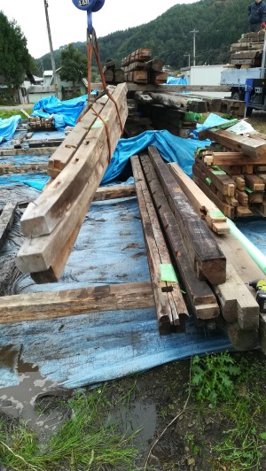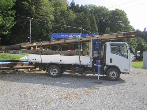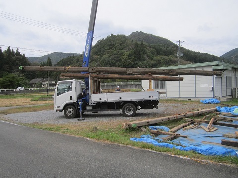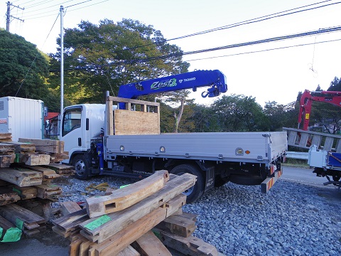 先週で土台も敷き込まれたので、いよいよ一度外していた材料を仮置き場から現場に搬送して、刻み加工の始まりです。