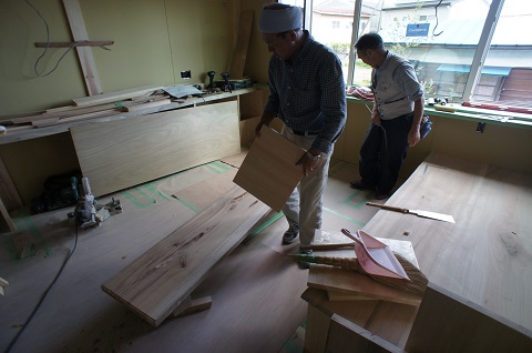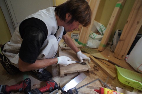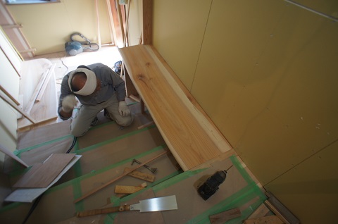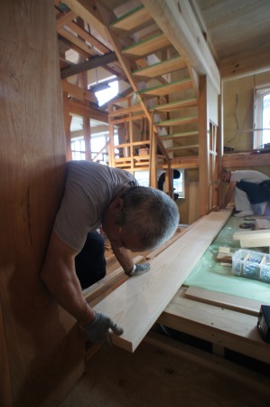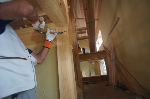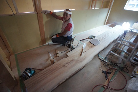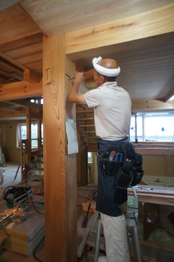 藤村&風山大工が和室赤松の敷居取付け中です。いい腕っぷしですね。(この後、けやきの大黒柱に敷居が綺麗に納まりました。)