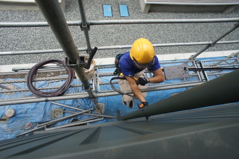 今週半ばの外部足場解体に向けて、外壁面も各設備取り付けが進みます。写真は電気屋さんが外線引込部とメーター取付け工事中です。
