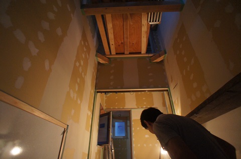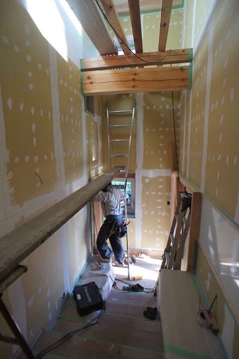 別の部屋では菊池が、どんどん出来上がっていく間仕切り下地に石膏ボードを張り上げています。