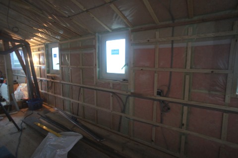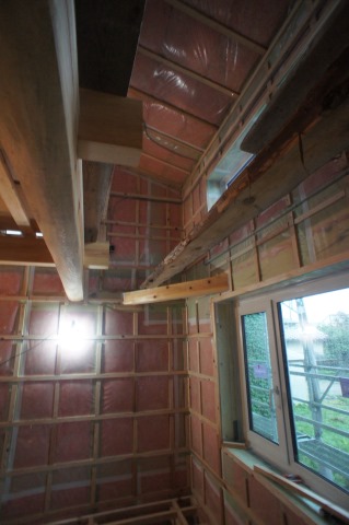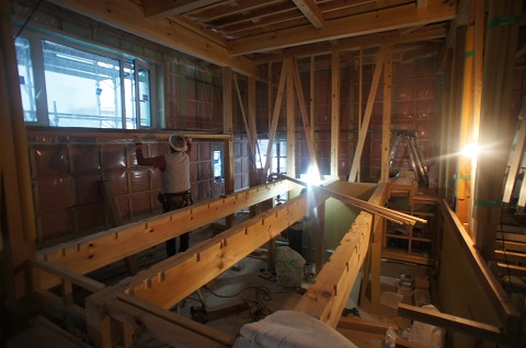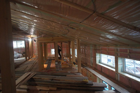 現在の青山の進捗状況です。二階は電気配線が終わり、一階は外周部壁面の断熱気密と下地工事が終わったので、床下地が出来次第、引き続き一階の電気配線工事となります。