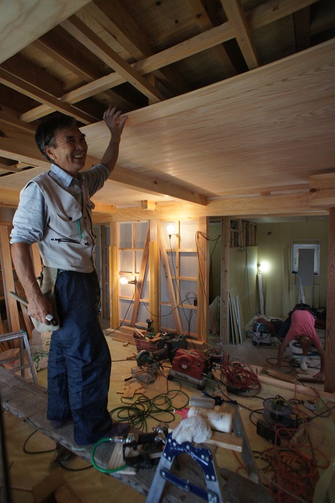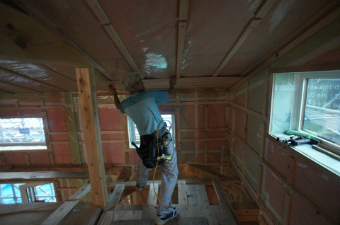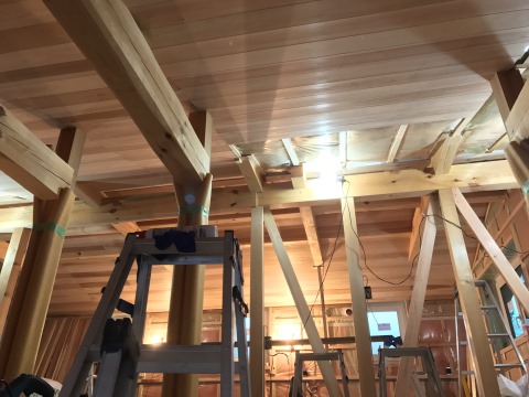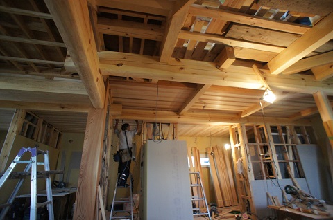 青山の新築では2階の杉無垢の天井板張りが終わりました。杉の香りがとてもいいですね。