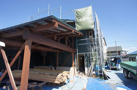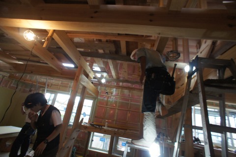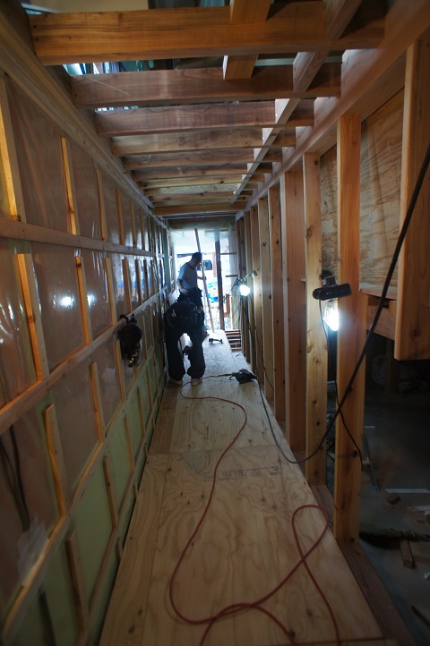 青山駅前の新築工事は、斜め天井の杉板張込みがはじまりました。