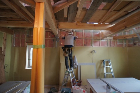 1階は建物外周部に防火と内装下地兼用で石膏ボード張りがはじまりました。