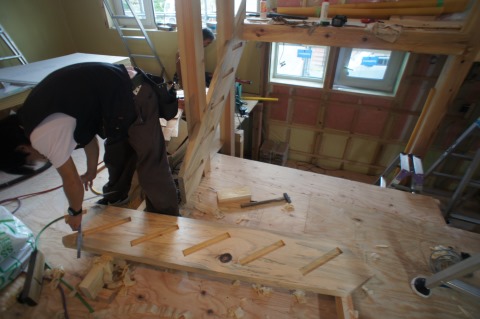 熟練風山大工に教わりながら内記が一緒に加工して取り付けをしています。