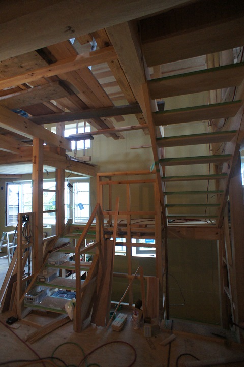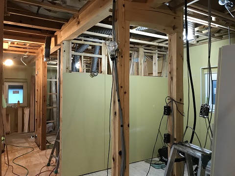 内部の進捗状況です。木の雰囲気がいい感じです。