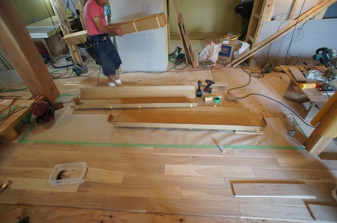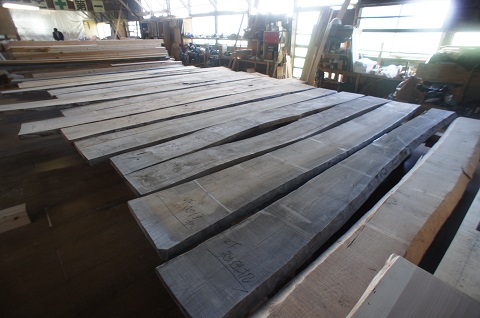 各種カウンター類の加工の準備が整いました。凄い量の広葉樹の幅広の厚板が並ぶと、者ぐ語意存在感です。これらが全て使われるお住まいです。