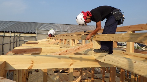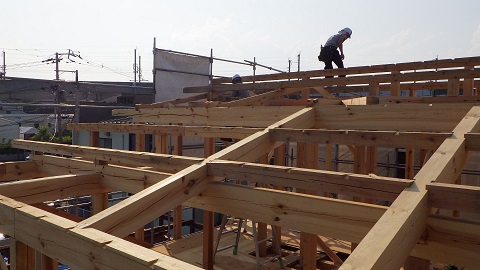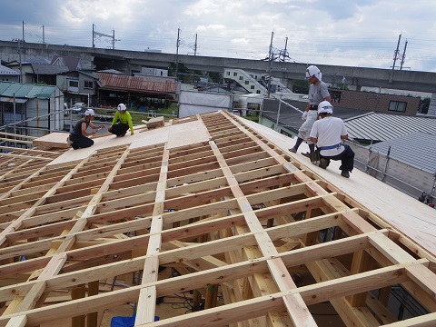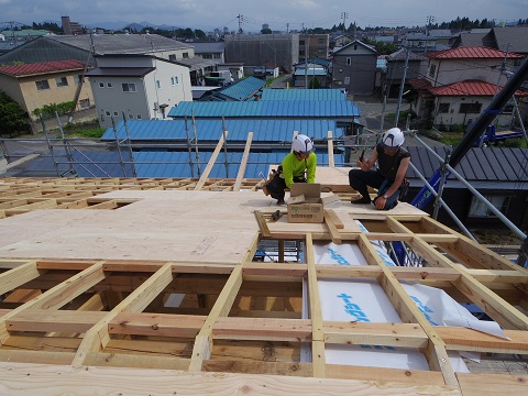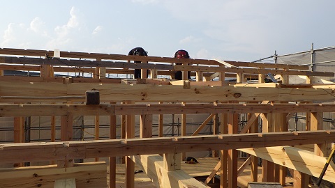 20代の大工見習の二人で懸命に野地合板を張っている風景です。この暑さは厳しいですが、お互い声を掛けながら、熱中症にならいように、ほどほどに頑張ろう!