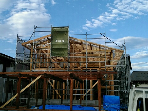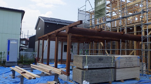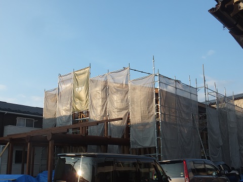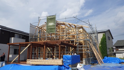 青山駅前でこ足場シートが目印です。現場の大工さんに声を掛けて、ご自由にご見学ください。でも、休みの日など、危ないので勝手には入らないよにお願いします。説明させていただきながらの現場見学会は、予定日の設定がまだできておりませんでしたので、申し訳ございません・・・もう少し涼しくなるのを待ちたいと思っております。