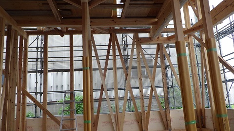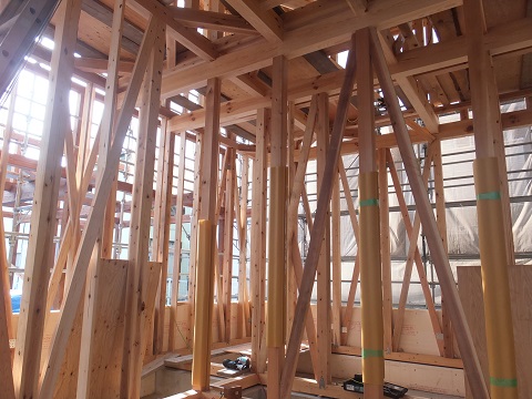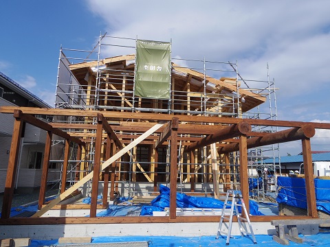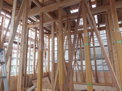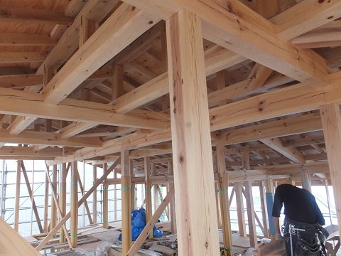 屋根を葺き上げた後は、構造工事が進みます。この段階でも、木材の使用量の多さが際立ちます。坪当たり1㎥が、当社の平均値となります。そして、ほぼ100%が地場木材です。