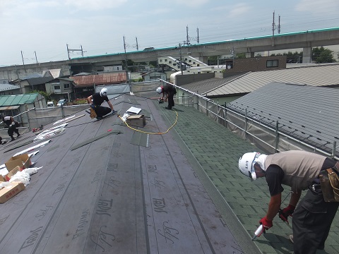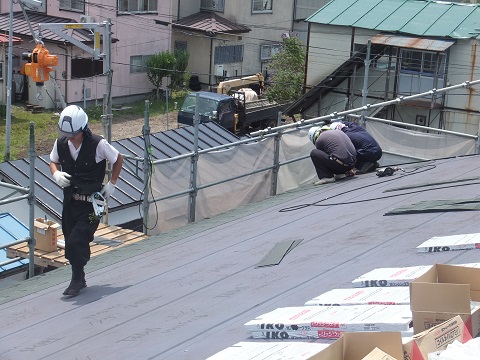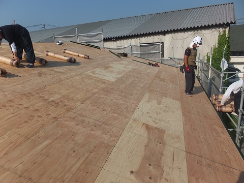 屋根葺きが進みました。猛暑の中1名ダウンしてしまいました・・・