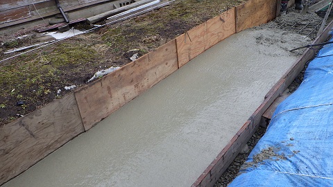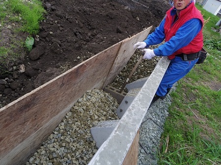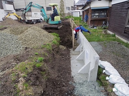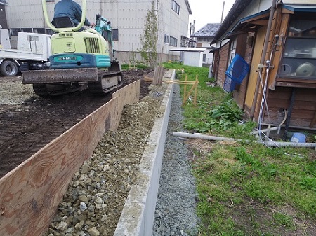 受託部の基礎根伐りと土留めの土入れを同時進行で進めています。土留め側は裏込め砕石が重要です。擁壁の計算時は内部摩擦係数をそうした事で選択した数値にしているので、計算に適した工事を行う必要があります。水はけの事も大切です。完成後の地盤面の処理も同様です。