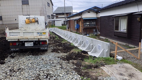 基礎工事前の土留め工事としてのL型擁壁の設置まで完了した青山駅前の新築現場です。連休明けからは基礎の根掘りが進められます。掘り上げた土を土留め側に押し出すことが出来るので、整地をしながらの工事となります。新車ダンプも随分と活躍しているようですね(笑)