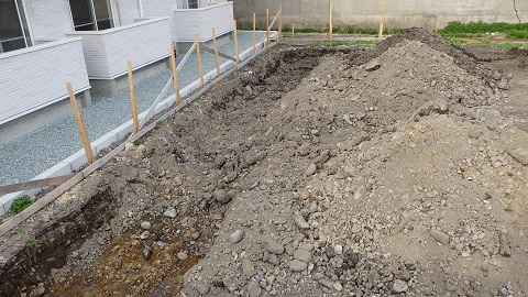 土留め擁壁工事が完了して、基礎の根伐りに着手するところになりました。