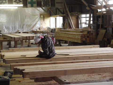青山の新築工事の構造材に使用する赤松の選別をしているところです。車椅子に乗りながらこれを行う大和田は棟梁の役どころと心得、頑張っております。