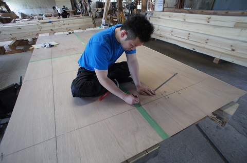 大和田の墨付けは、原寸出しへと仕事が進みました。宮大工さんの原寸工程と同様に実際の大きさで図面を書き起こして細部の収まりを検討したり、墨付けの為の型造りを行います。車椅子から降りて、この姿勢で頑張る大和田でした。健常者大工でも出来ない人がいるのです・・・・