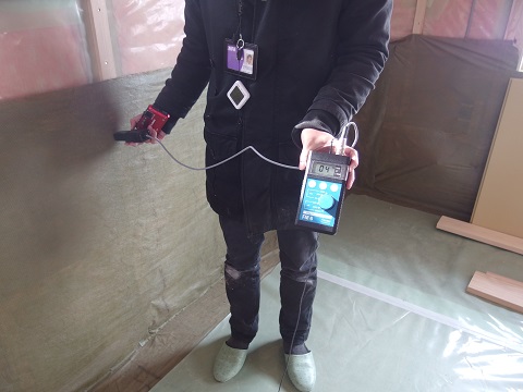 シートが施工されたところは2v/mと電磁波は削減されています。この部分には電気配線が施工されているので、電気屋さん立ち合いで、通電しての検査との事でした。一般家庭だと125v/mにもなるのだそうです。電磁波の脅威にさらされる現代の恐怖ですね・・・