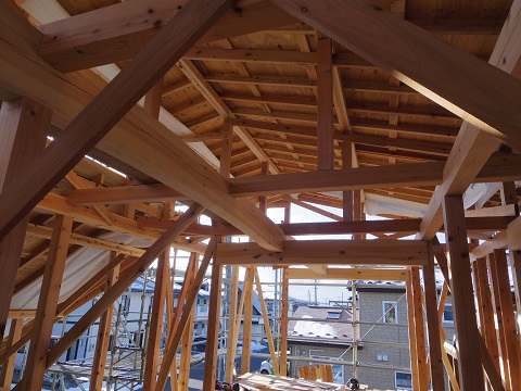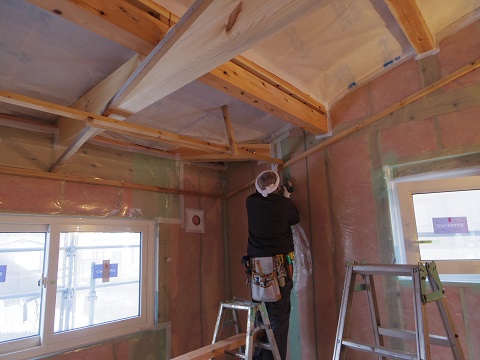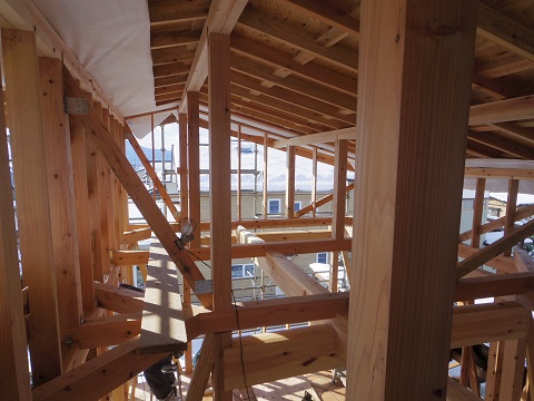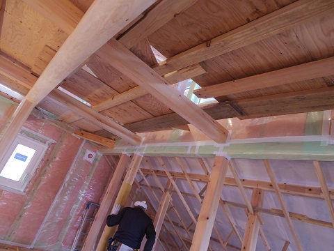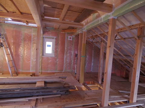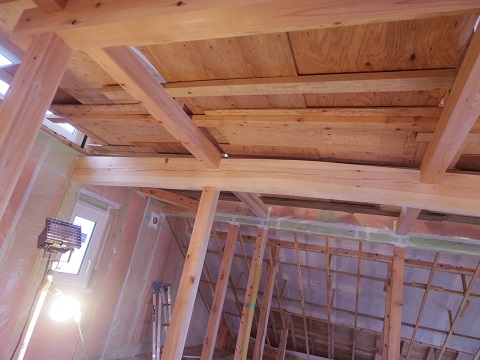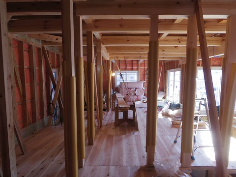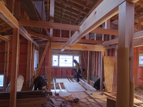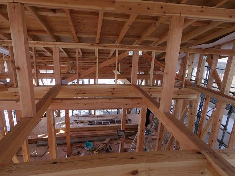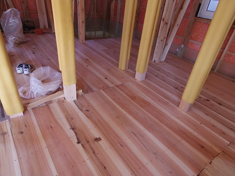 前回の更新写真の続きになりますが。2階の床下地組が完了したので、床の捨て貼りも出来ておりました。構造合板を使用せずに、杉の無垢板を自社製材で準備して張り込みました。接着剤も使わずに、化学物質を排除した健康促進住宅です。