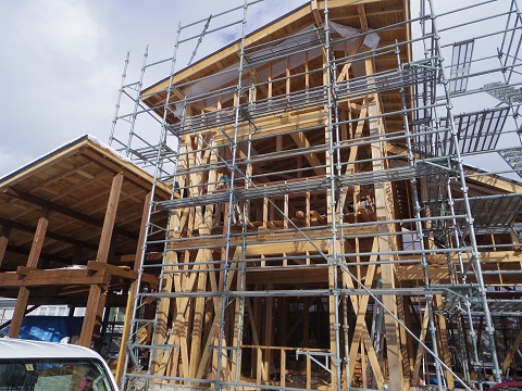月が丘の新築工事は屋根葺きが進みましたが、車庫屋根に足場を掛けないと北側の軒先工事が出来ないので、昨日足場工事を進めたようです。明日10日は友引・昴の大吉日にて上棟式です。