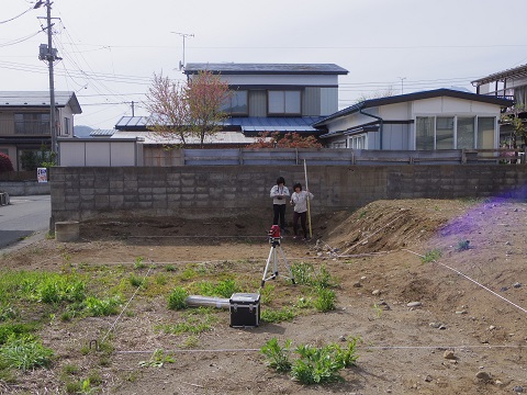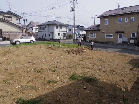 地盤改良工事の予定が迫るので、改良杭の配置出しを暑い中栗城先輩と新人相川が頑張っています。
