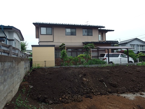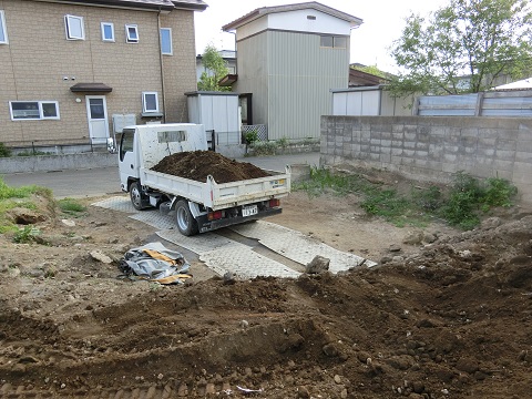 月が丘の新築現場の土出しをしています。良い黒土に見えたのですが、地盤改良工事のセメントが混在していて、残念ながら廃棄しています。