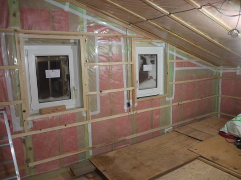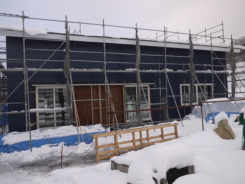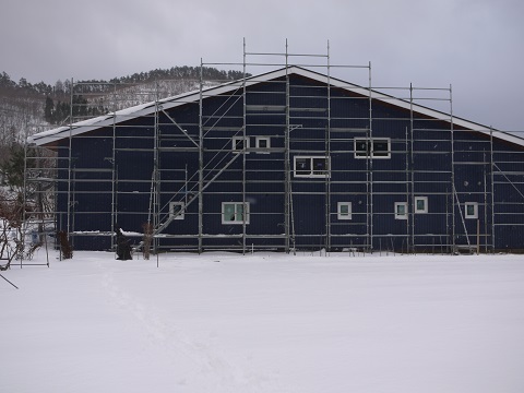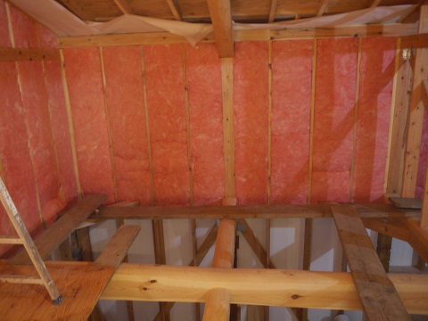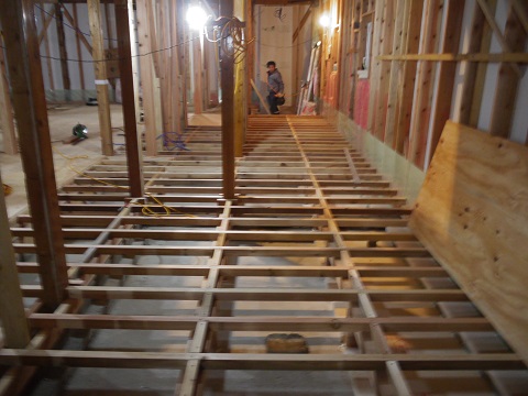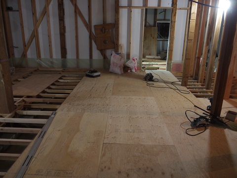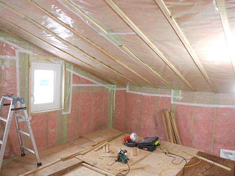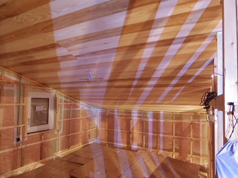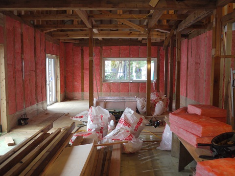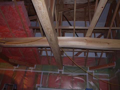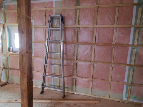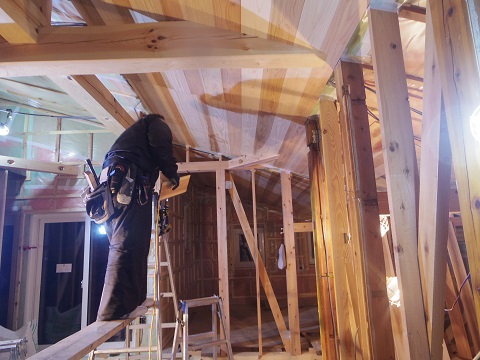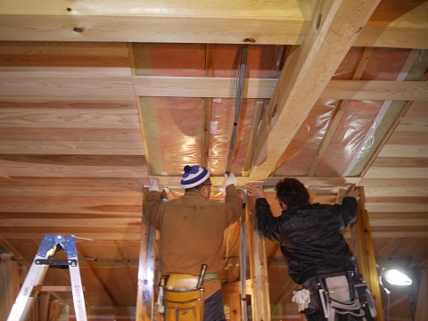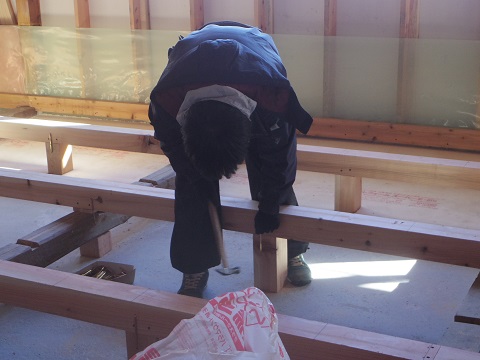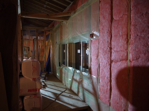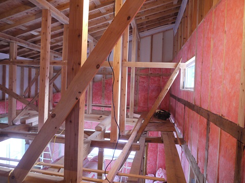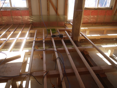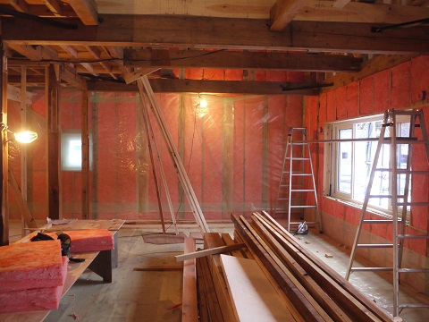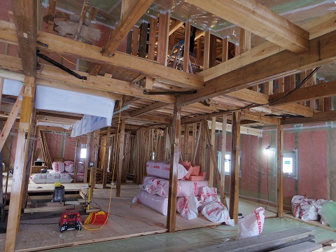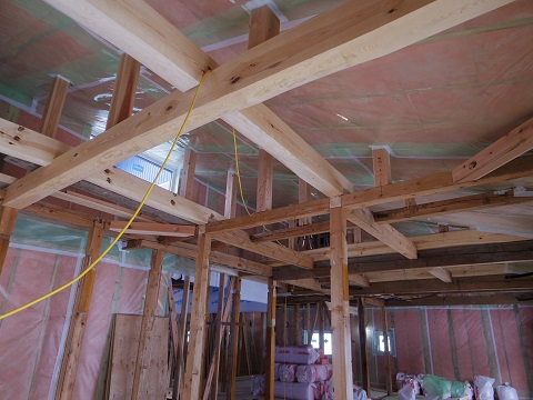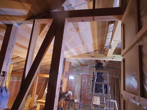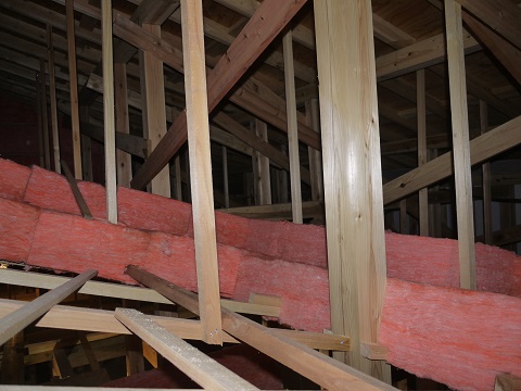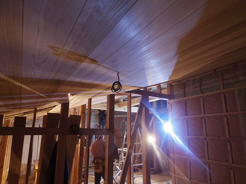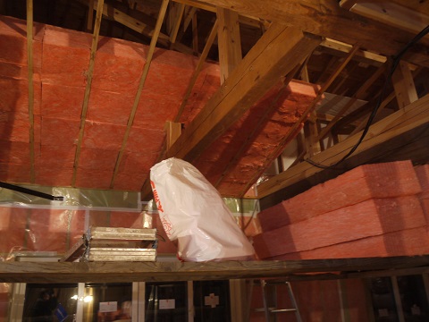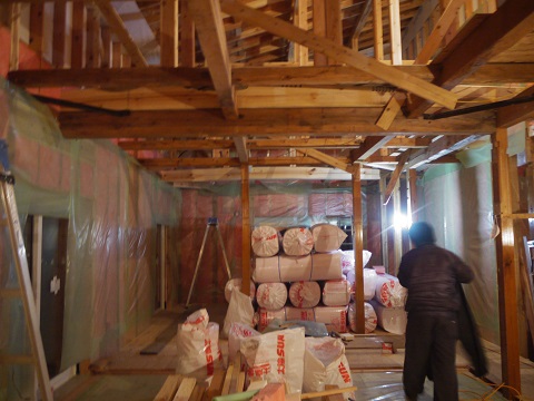 構造補強した赤松の梁の上側を包み込むように断熱を入れて梁を表しにしています。大分ゆっくりとしたペースでしか工事が進まない感じがすると思いますが、こうした工事をしないで単純にうわべのみ綺麗にする仕事をしてしまえば早くは進みます。でもそれは手を抜く事になるのです・・・時間を掛けた分は改修工事と云えども新築と全く遜色ない工事になります。と云っても我々も早く完成させねばと焦りの気持ちは生じます。震災前は応援大工さんが多かったのですが、震災以降は本当に人手不足で悩ましいですね・・・実は、震災前の日記で世の中が、職人不足で困らぬように対策が必要と書いていたのものです。