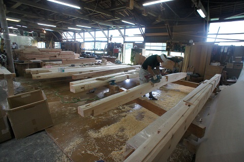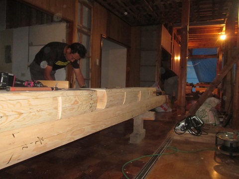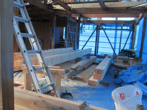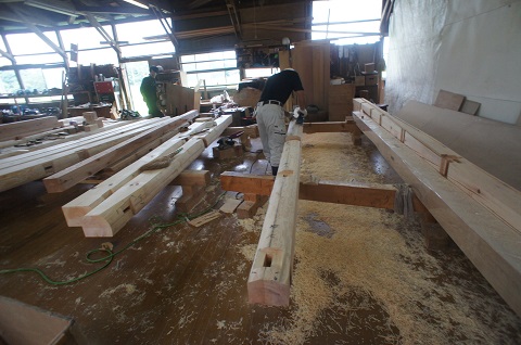 構造補強材の刻みが進んでいる、姥小石の大改修工事です。