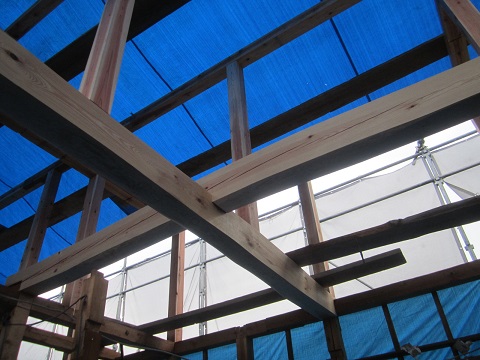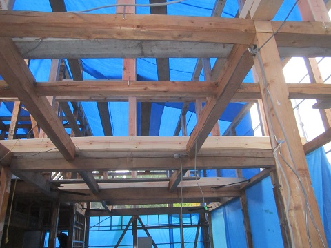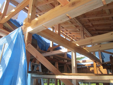 昨日に続いての追加ですが、6mの長い赤松の梁材で補強された上部空間は端から端まで繋がるので、筋違いなど構造耐力壁とも接続されて丈夫な架構を構成します。