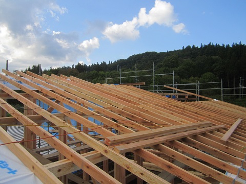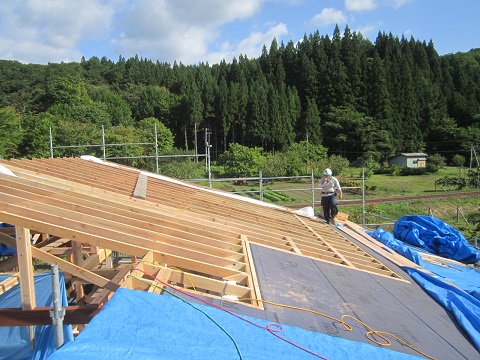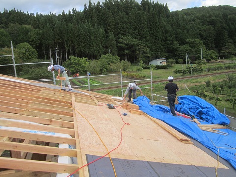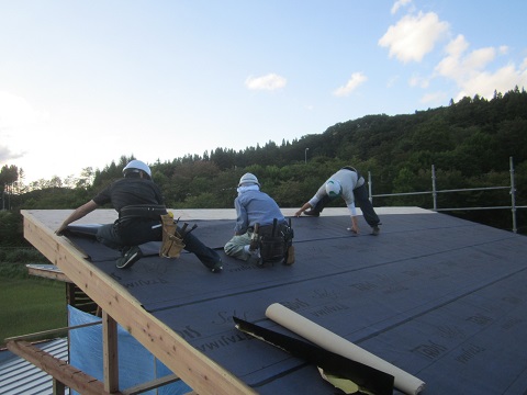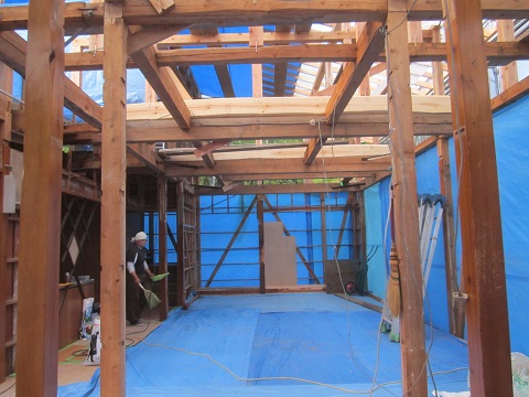 屋根の架け替え工事が進む大改修現場です。野地合板を張り上げると直ぐに防水のゴムアスシートを張り込んで、雨対策をしながらの工事が進みます。