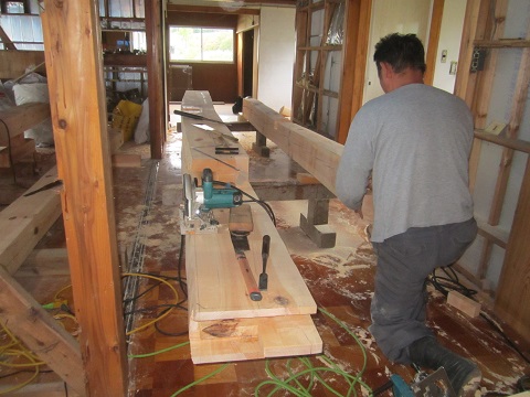 技能五輪全国大会2回出場の熊谷も慣れない改修工事でも新築同様構造材加工で頑張っています。