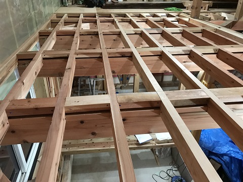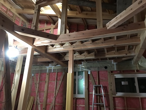外部を囲い込んで、内部の床下地組が進んでいます。外部は外壁工事待ちとなっております。