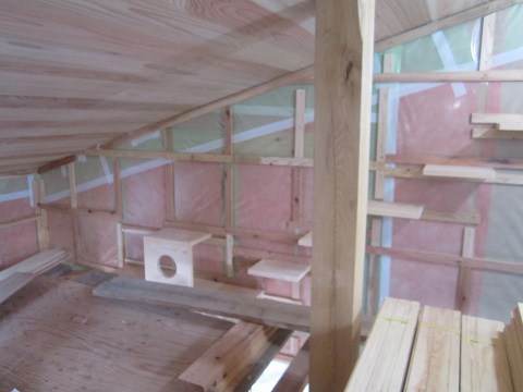 内部は断熱防湿が完了してPBの張込みが進んでいます。写真は猫用の階段です。