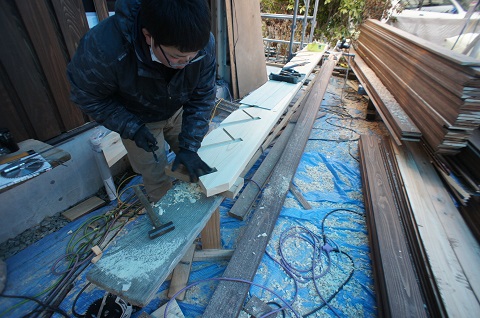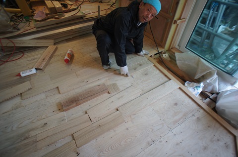 床を張る工藤大工です。楢の無垢床は素敵ですね。