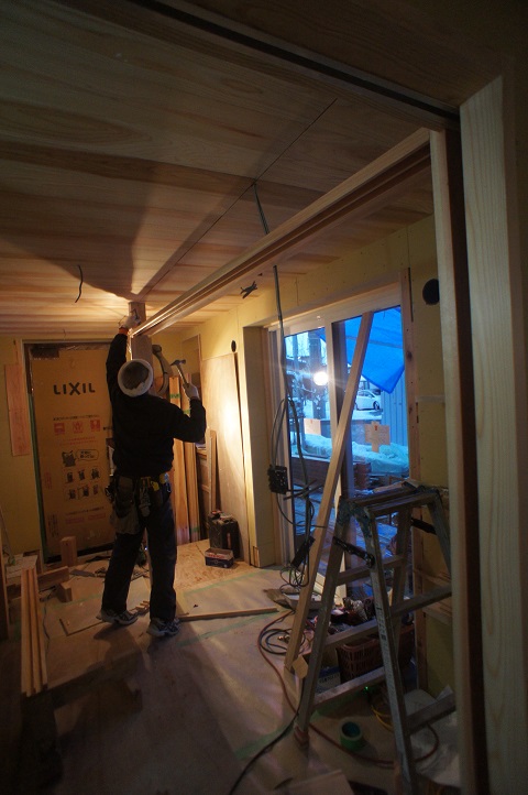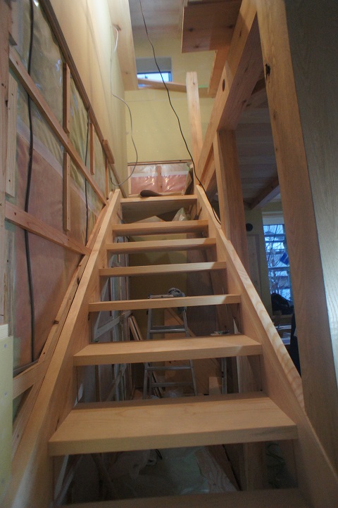 内部では階段の取り付けと建具枠など造作工事が進んでいます。階段は、技能五輪大会二年連続出場の熊谷が初担当しましたが、こうして細部にその成果が出ていますね。