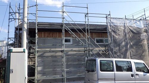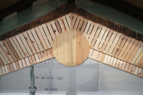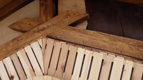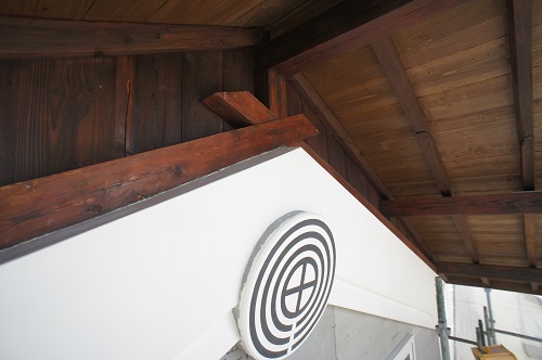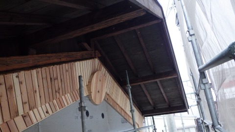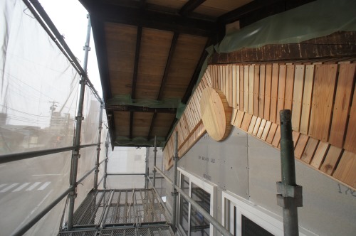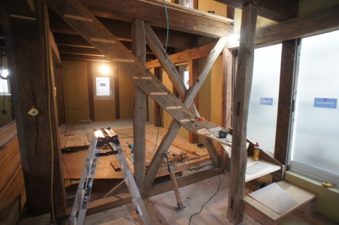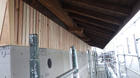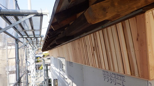 鉈屋町蔵の改修現場では、古材を再利用加工した雰囲気のある筋違いと階段の工事中です。また外部は左官工事の前に軒裏の汚れを取ってから柿渋を使って塗装をしました。落ち着いた雰囲気にまとまりました。