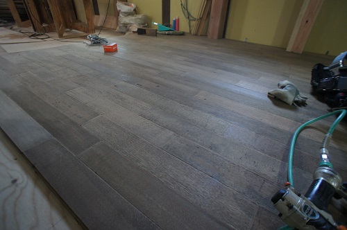 鉈屋町蔵の改修工事は、外周鉢巻部分の中塗りが終わり養生期間を得て、今週から漆喰塗り仕上げ工事が始まります。また、内部土間床にはこの蔵から一度外した壁板を磨いて今度は床として再利用し張っています。