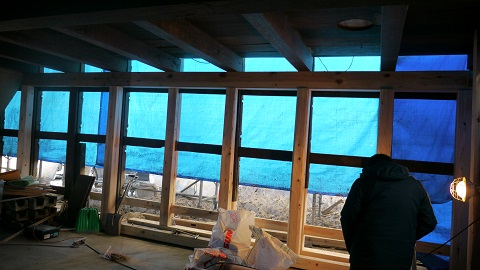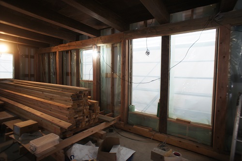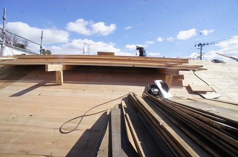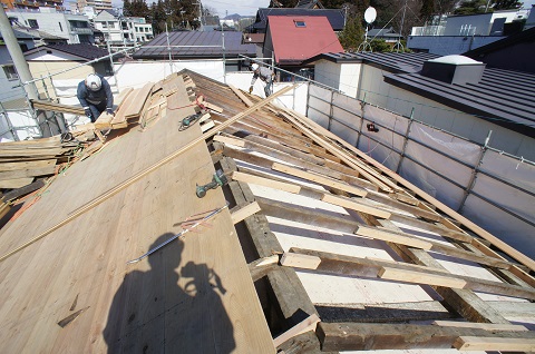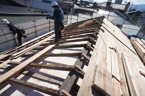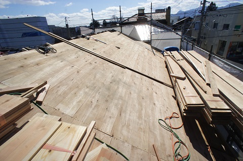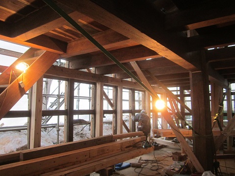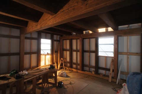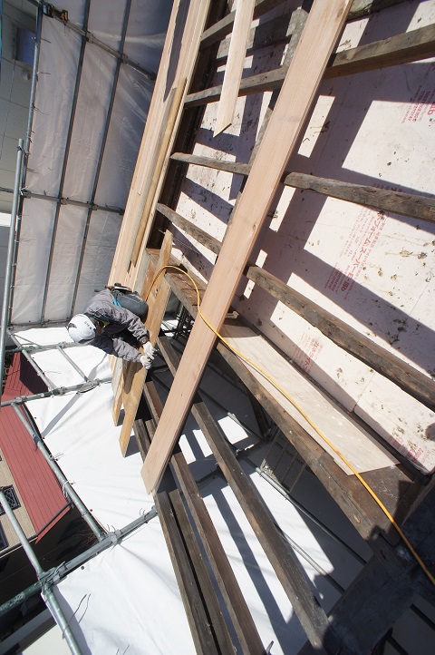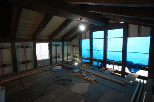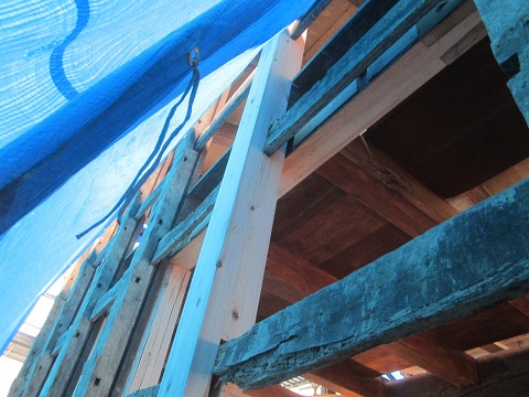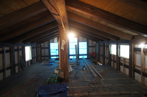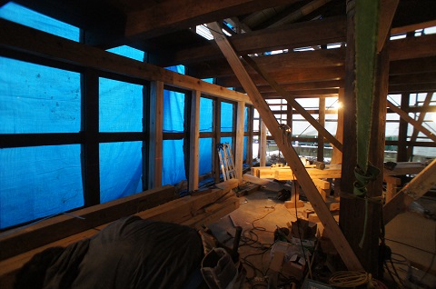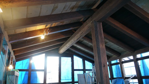 1階の構造補強を詩乍ら建物の歪みを直し、屋根の腐食した登り梁も取り替えて、屋根の下地板まで梁進めました。来週は屋根葺きが始まります。